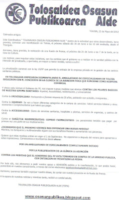 -Asamblea abierta a la ciudadania que se celebrará el sábado 16 de Junio a las 12 del mediodia en la Casa de Cultura de Tolosa, donde uno de los temas a tratar será las Plantillas funcionales es decir una comparativa del número de especialistas  que existe en la Clinica de la Asuncion con respecto a otros Hospitales Comarcales.